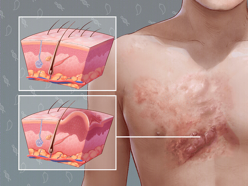 疤痕疙瘩是以具有持續性強大增生力為特點的疤痕,經常會出現在周圍健全的皮膚。疤痕疙瘩多發於青壯年。此病隆出表皮,大小不一,高低不平,形狀不規則,皮膚硬呈紅色且伴有瘙癢。